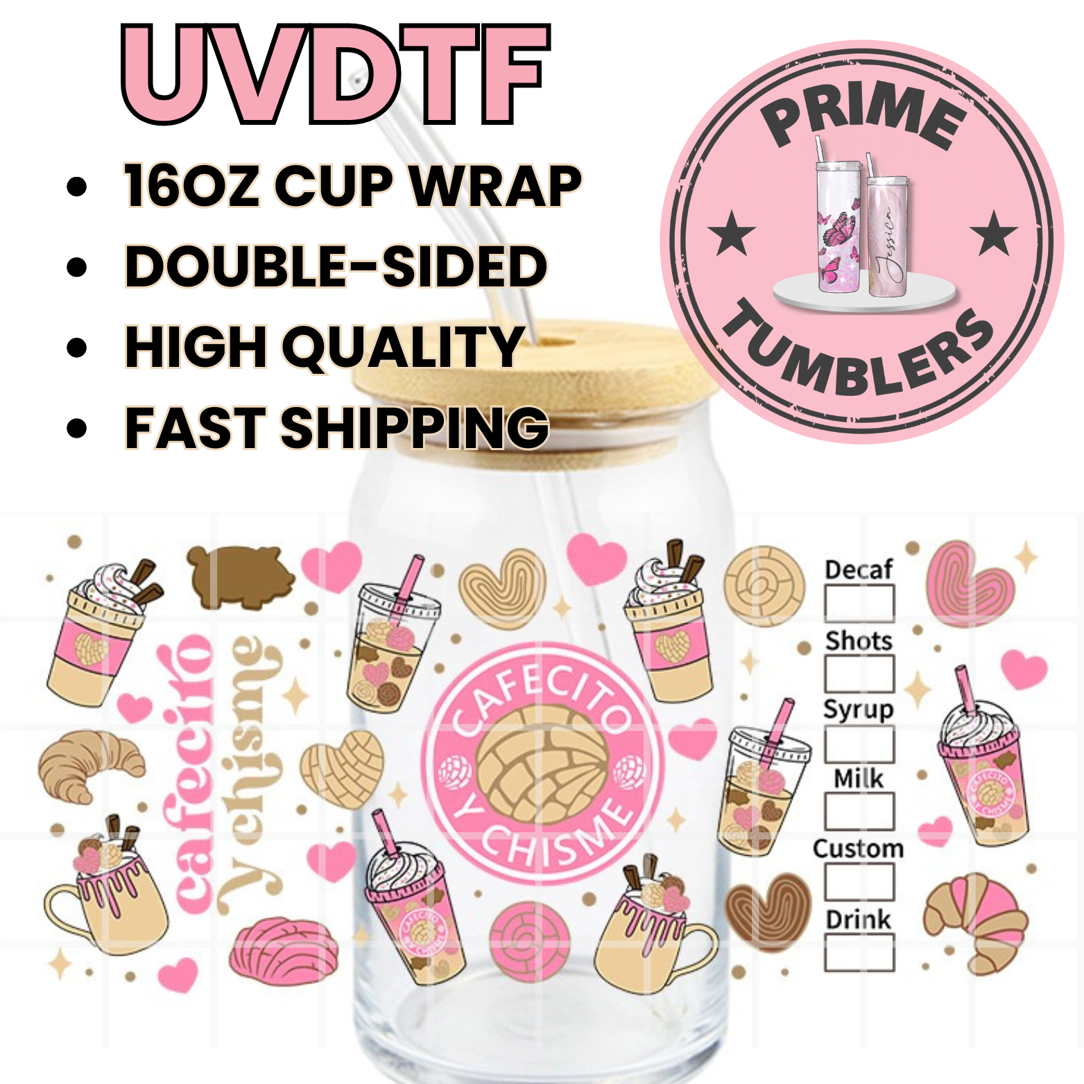 Cafecito y chisme tan coffee 16oz UVDTF cup wrap, ready to apply STICKERS