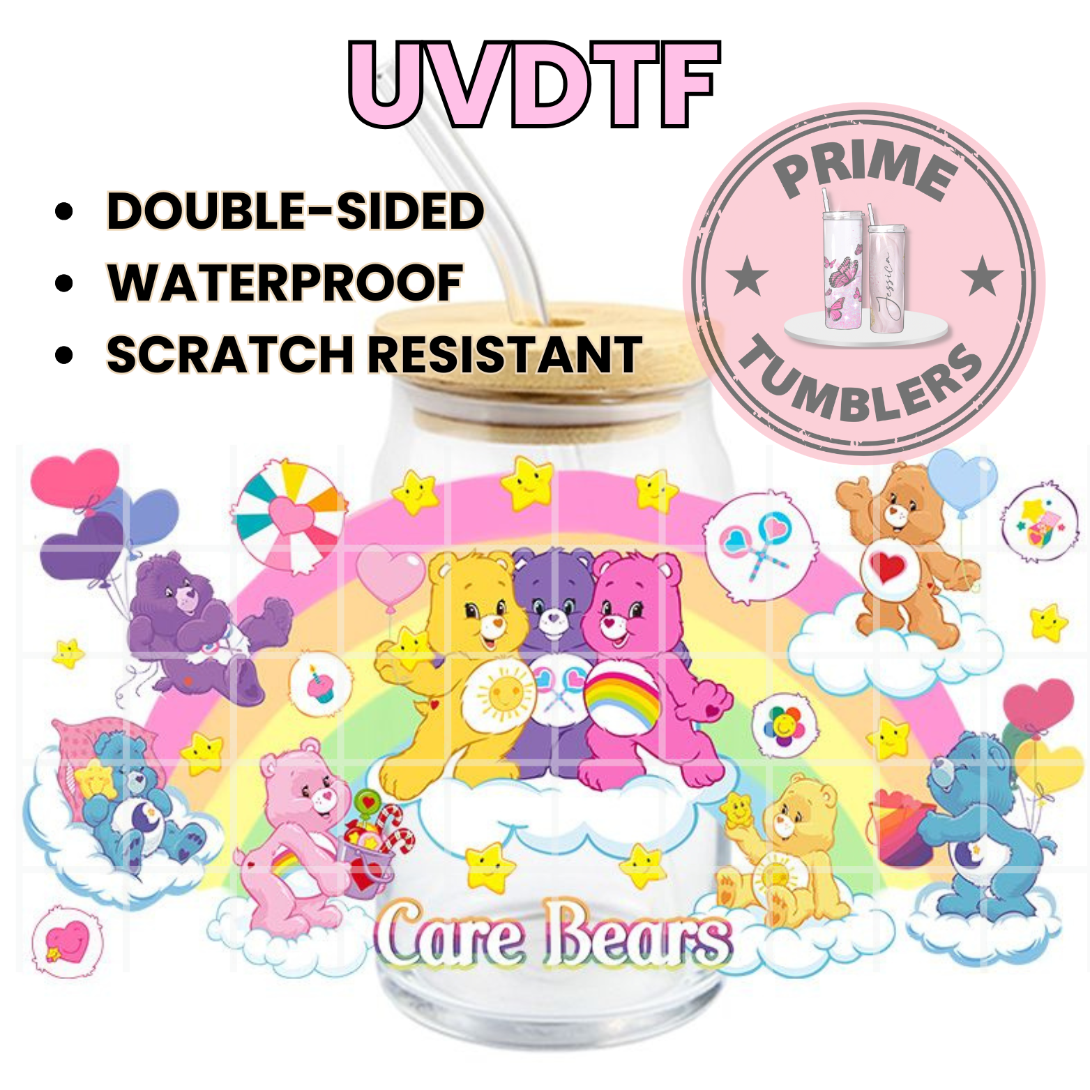 CareBEARS rainbow 16oz UVDTF cup wrap, ready to apply STICKERS decal Care Bear