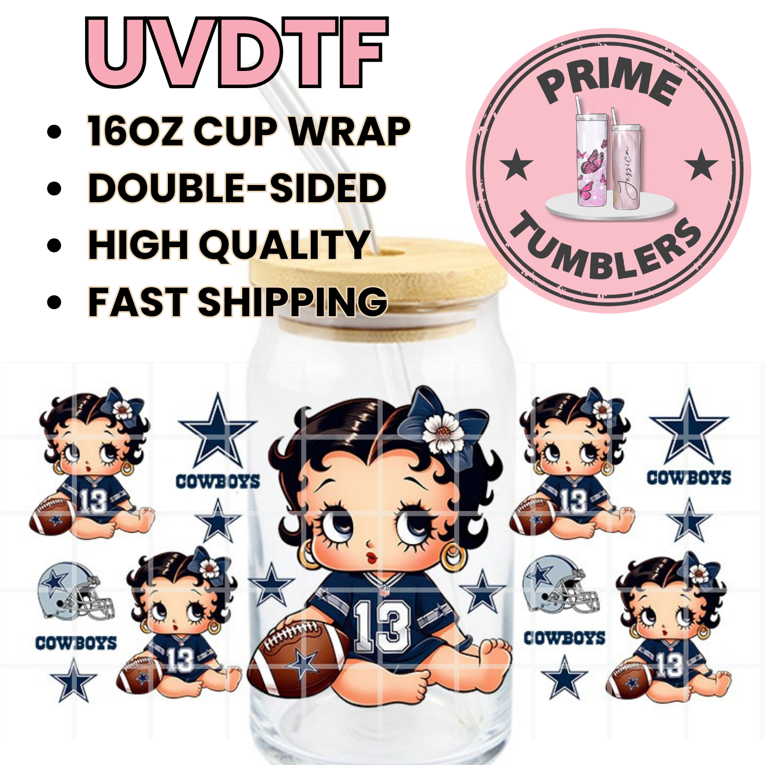 Dallas COWBOYS Texas BP Betty Boop Football 16oz UVDTF cup wrap, ready to apply STICKERS