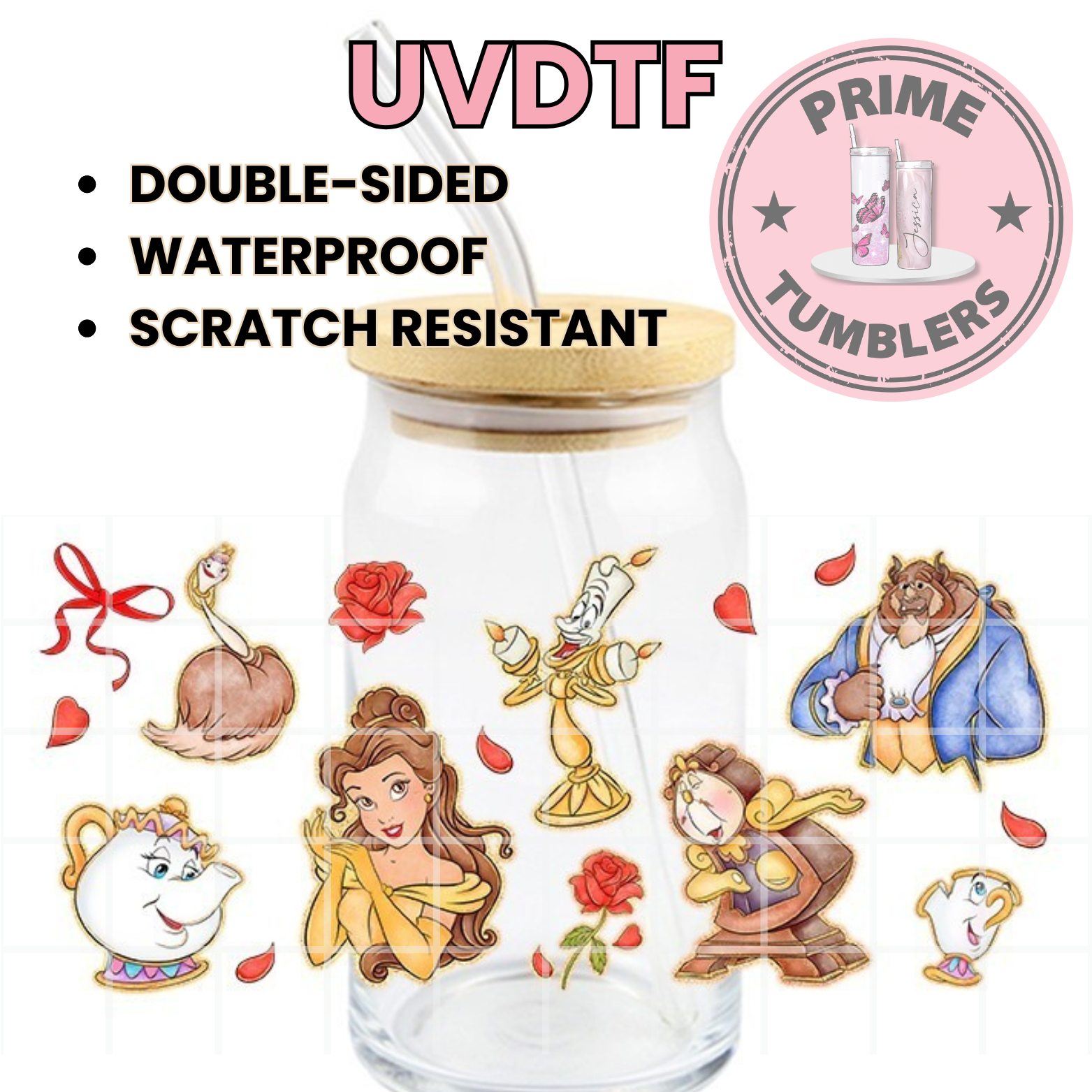 Disney Princess movie Beauty Belle and the Beast 16oz Libbey Glass Cup Wrap UVDTF, Ready to apply decal STICKERS red roses Mrs. Potts, Chip, Lumière, and Cogsworth
