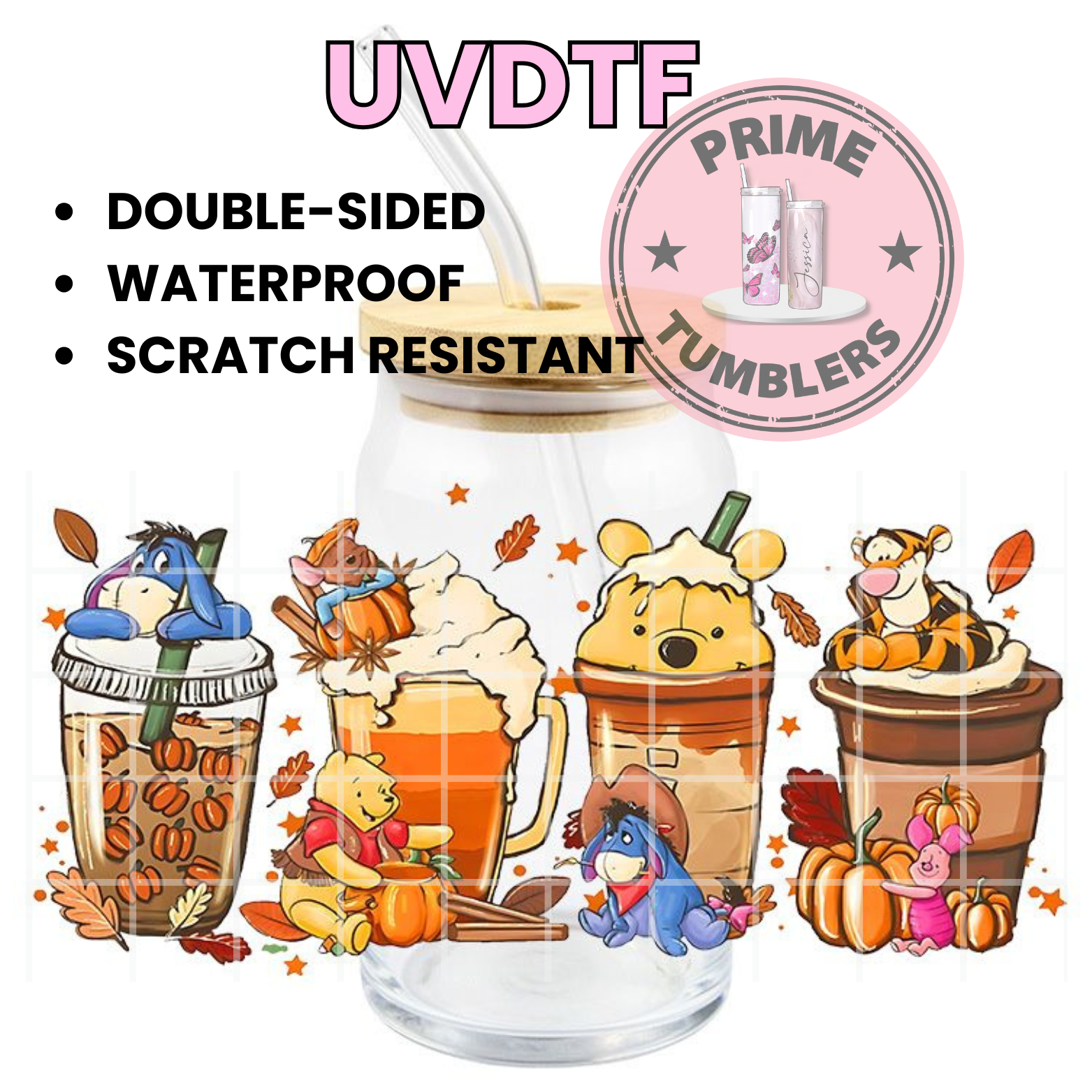 Disney’s Winnie the Pooh Bear and his friends piglet, Tigger, and Eeyore FALL 16oz Libbey Glass Cup Wrap UVDTF, Ready to apply decal STICKERS Walt Disney Hundred Acre Wood
