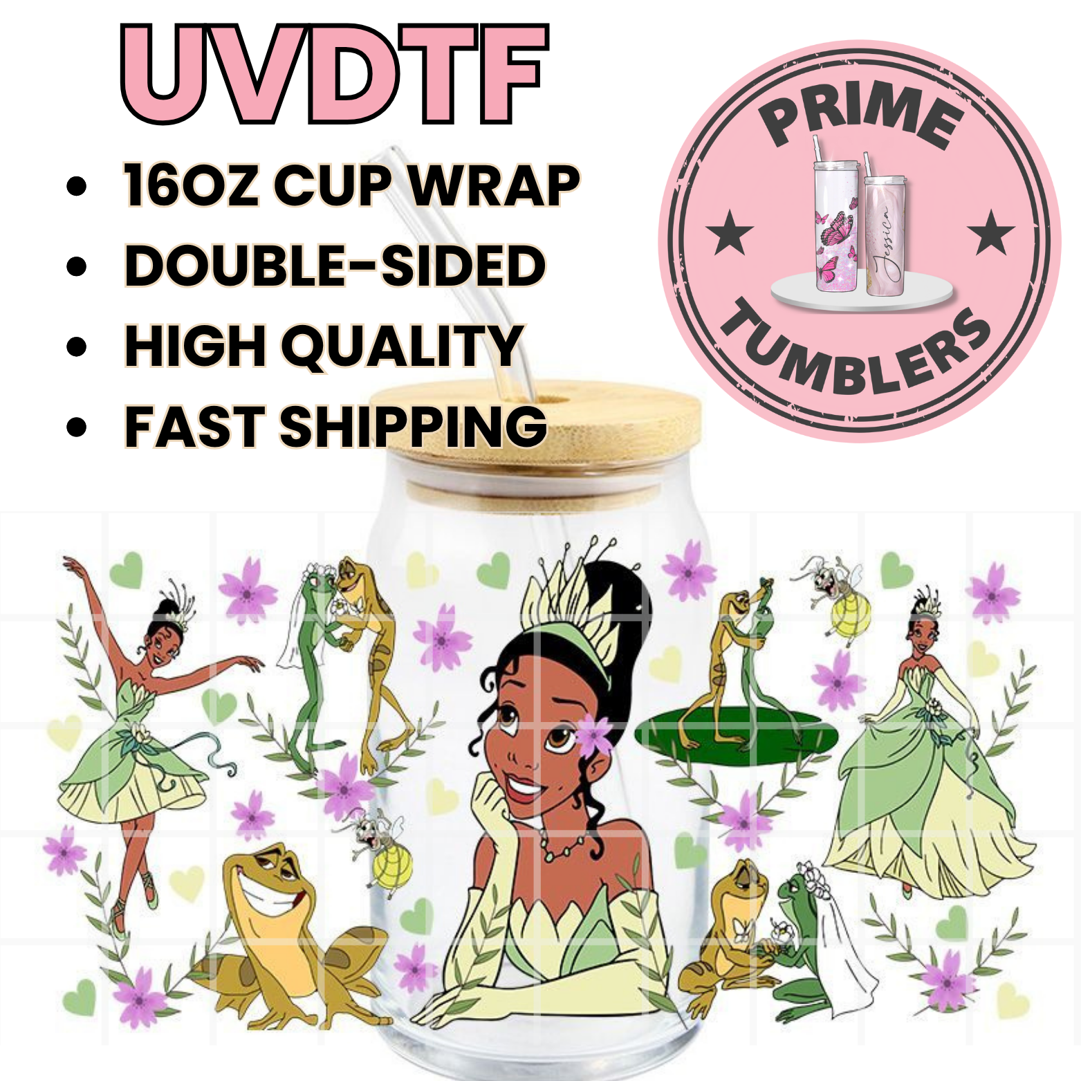 Princess Tiana and Prince Naveen as a green frog 16oz UVDTF cup wrap, ready to apply STICKERS decals