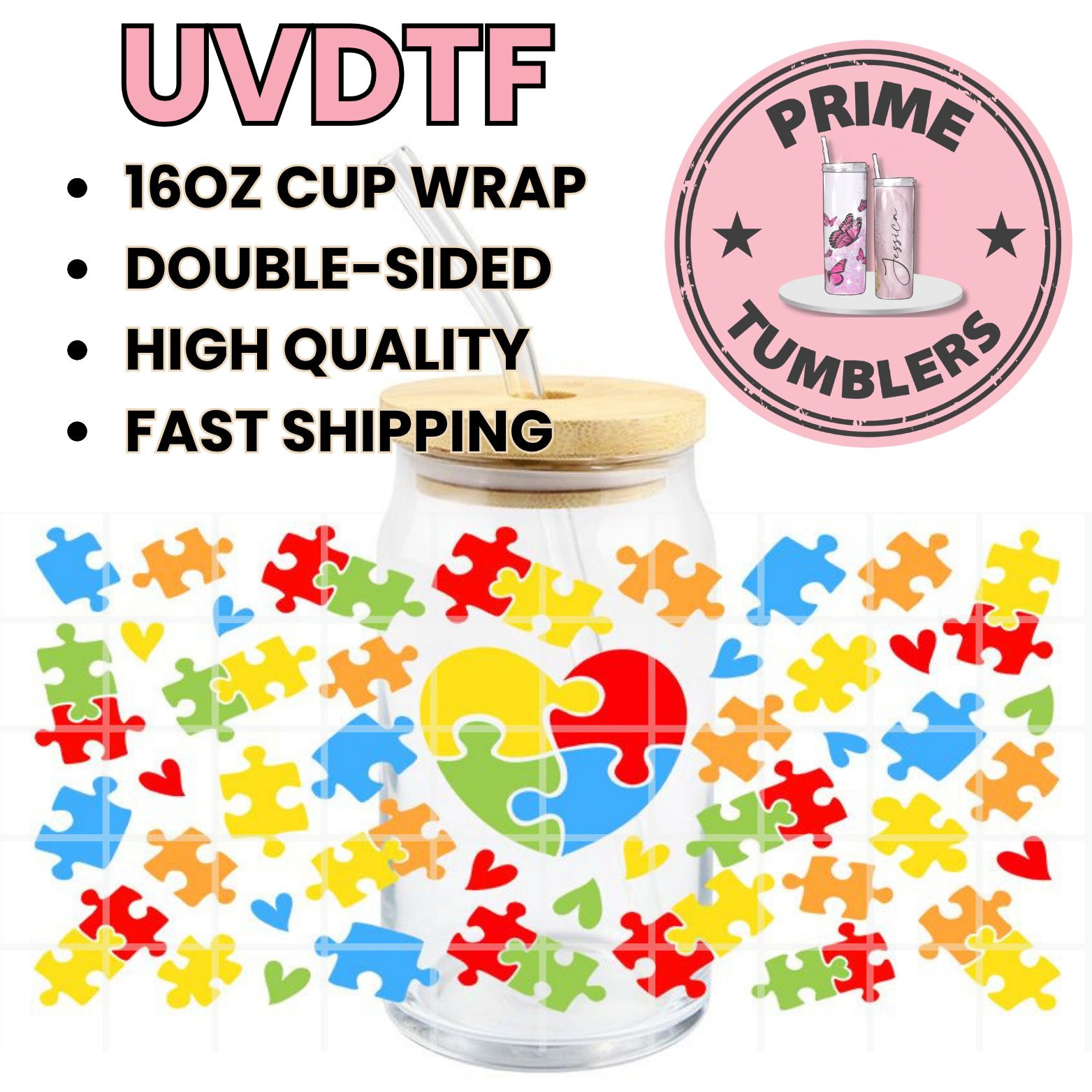 Autism AWARENESS heart puzzle 16oz UVDTF cup wrap, ready to apply STICKERS