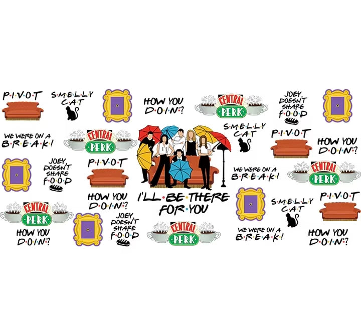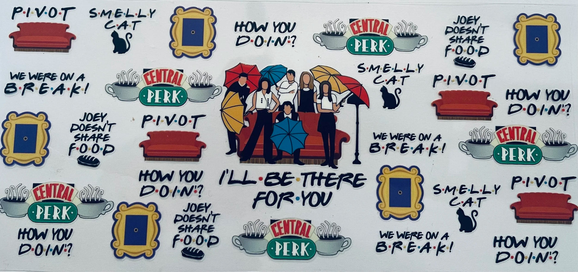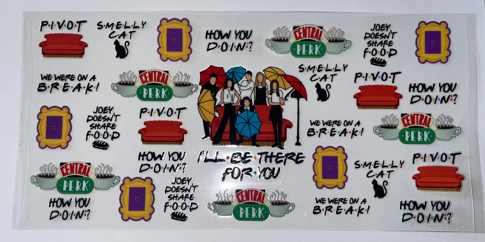 American show Friends Monica, Chandler, Phoebe, Joey, Rachel, and Ross PIVOT, HOW YOU DOIN'?, WE WERE ON A BREAK!, JOEY DOESN'T SHARE FOOD, SMELLY CAT, and I'LL BE THERE FOR YOU 16oz Libbey Glass Cup Wrap UVDTF, Ready to apply decal STICKERS