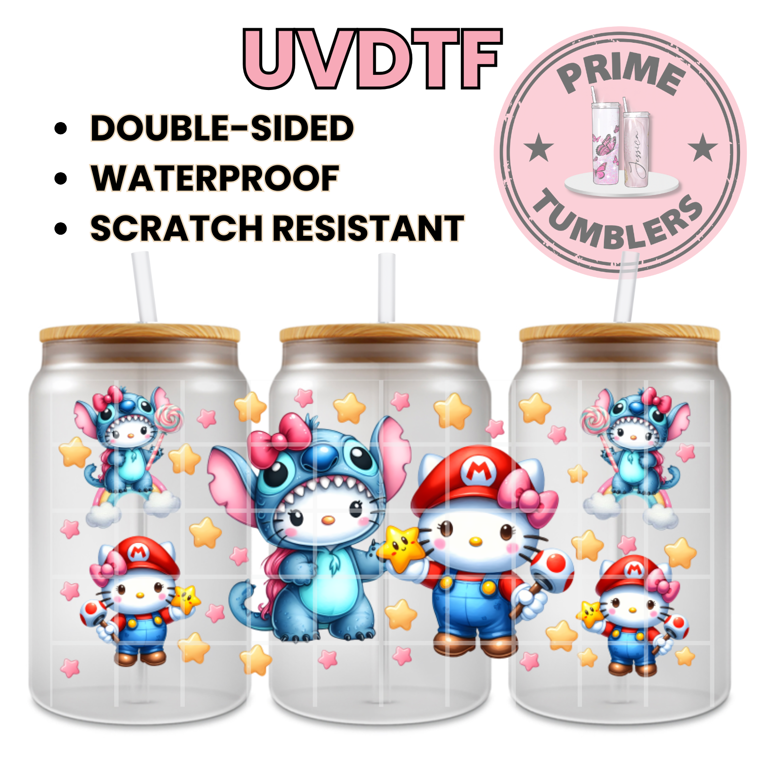 Hello Kitty Stitch and Mario 16oz UVDTF cup wrap, ready to apply STICKERS Sanrio HK Kawaii