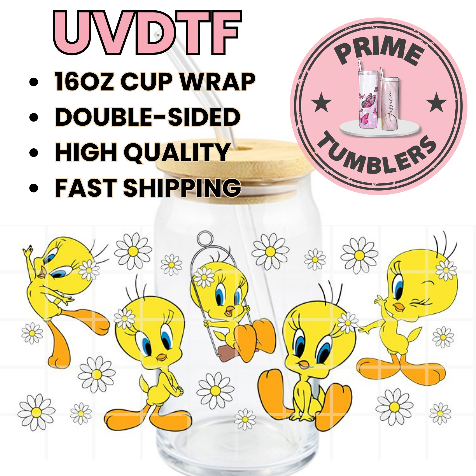 Tweety Bird flowers yellow 16oz Libbey Glass Cup Wrap UVDTF, Ready to apply decal STICKERS Warner Bros Looney Tunes