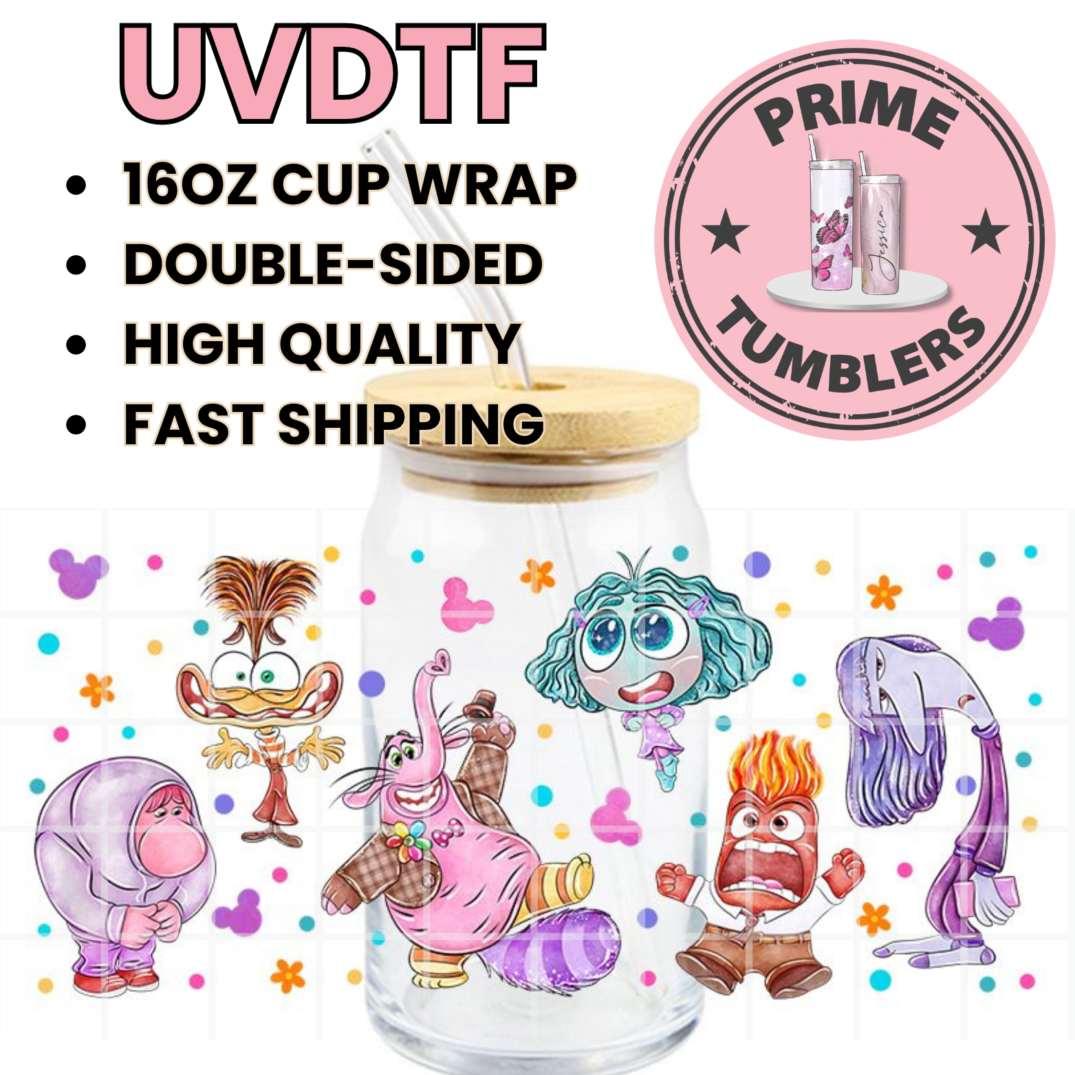Disney INSIDE OUT 2 pixar movie 16oz UVDTF cup wrap, ready to apply STICKERS Decals Sadness, Anger, Disgust, Bing Bong and Anxiety
