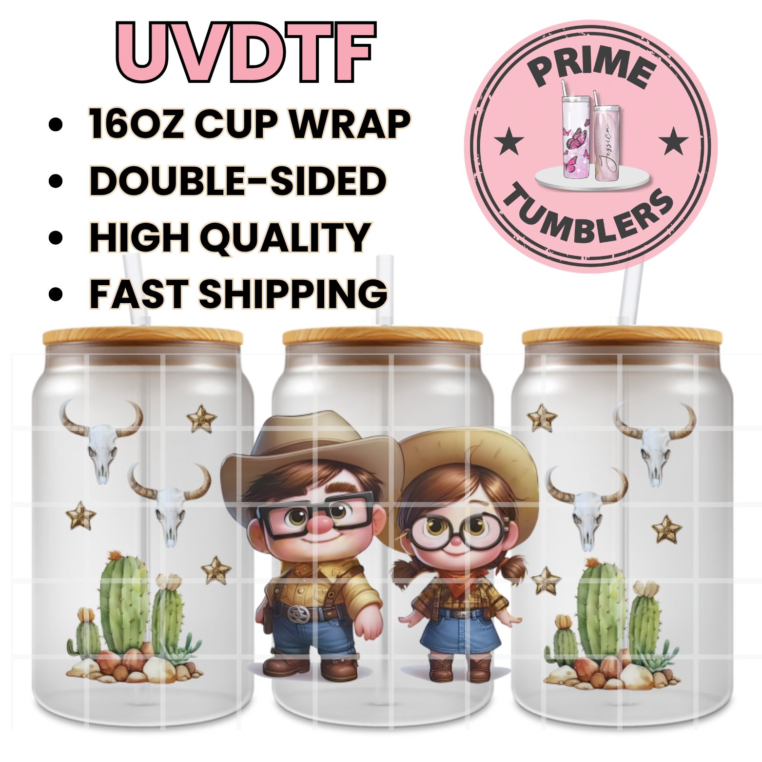 Disney-Pixar movie UP Carl and Ellie Fredricksen 16oz UVDTF cup wrap, ready to apply STICKERS Western Cowboy Cowgirl cactus and bull skulls