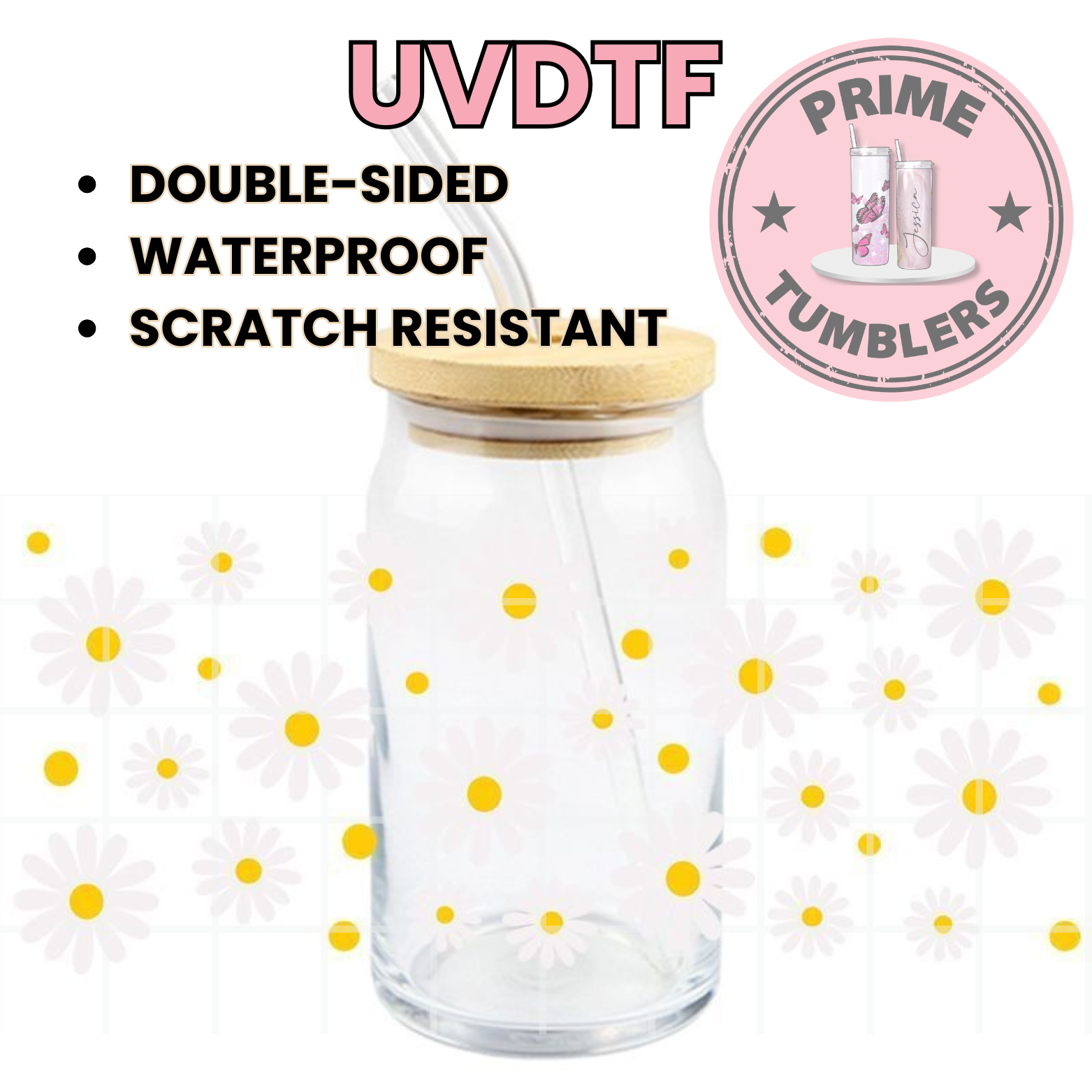 White DAISY flowers 16oz UVDTF cup wrap, ready to apply STICKERS flower yellow decal