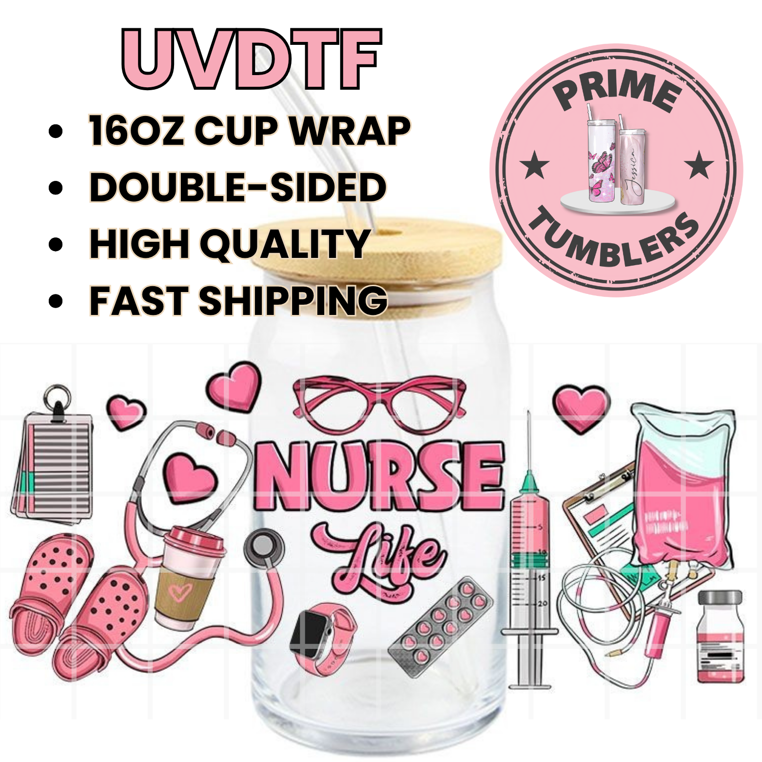 Pink NURSE 16oz UVDTF cup wrap, ready to apply STICKERS on
