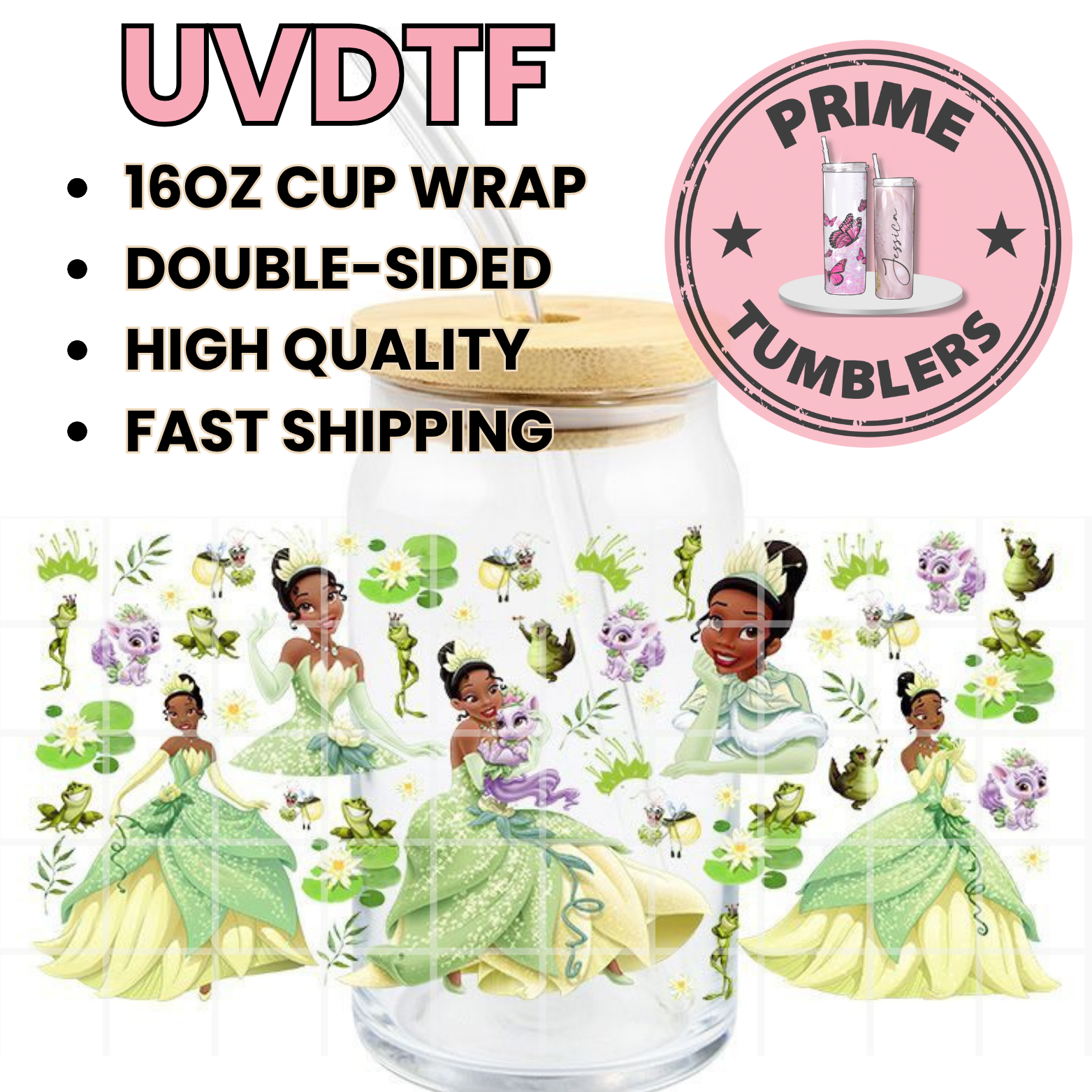 Princess Tiana black 16oz UVDTF cup wrap, ready to apply STICKERS z