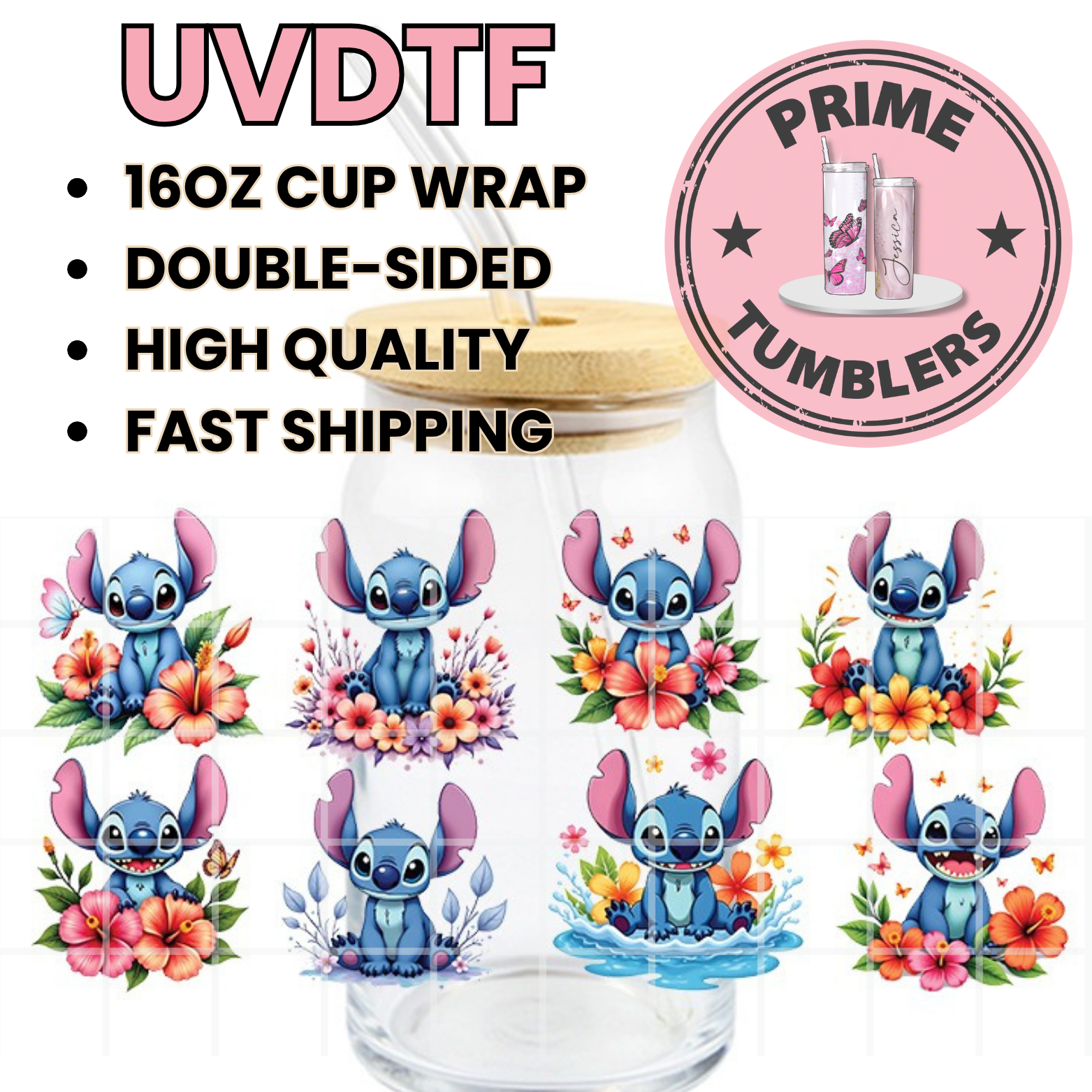 Disney movie Lilo & Stitch 16oz Libbey Glass Cup Wrap UVDTF, Ready to apply decal STICKERS tropical flowers and butterflies