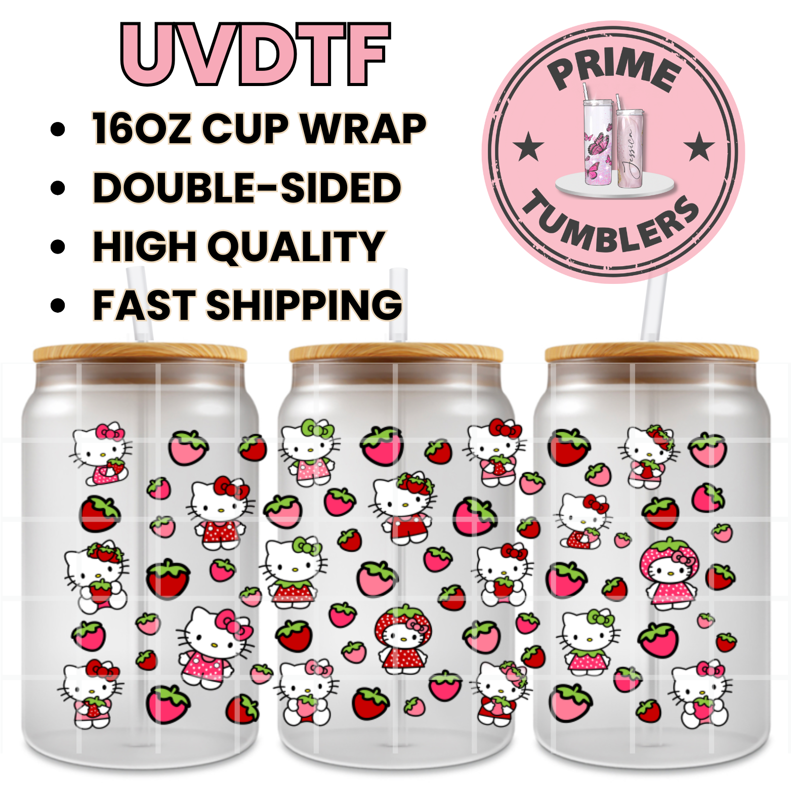 Strawberry Hello Kitty pink and Red 16oz UVDTF cup wrap, ready to apply STICKERS Sanrio HK strawberries Kawaii