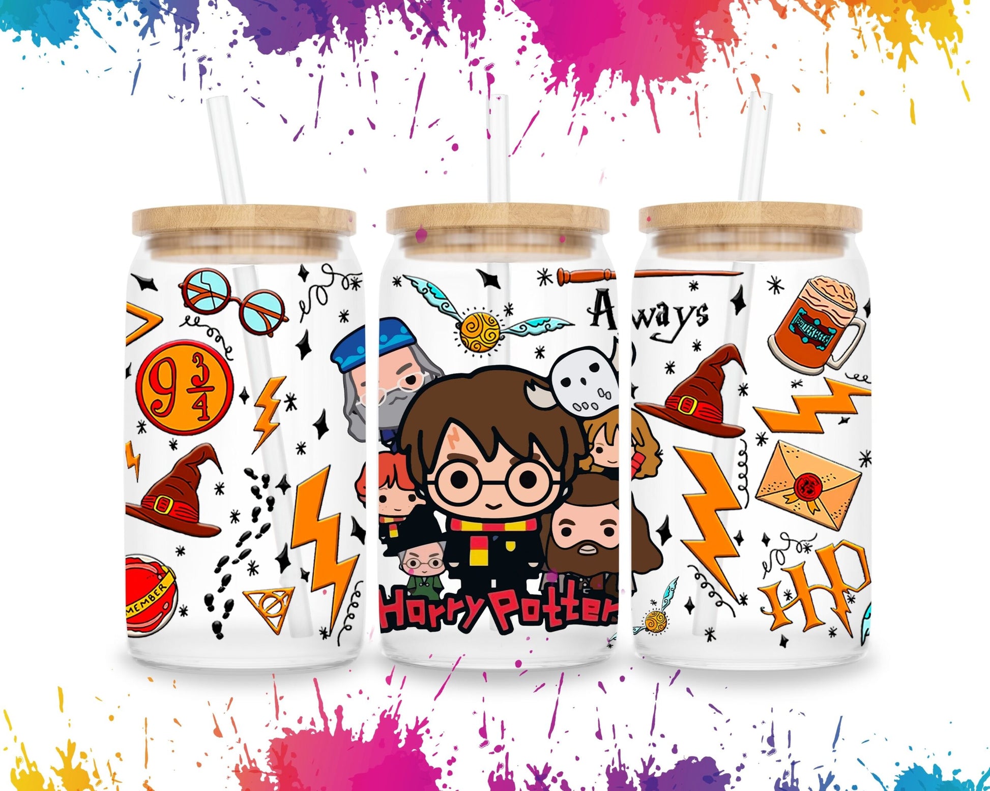 Harry Potter 16oz Libbey Glass Cup Wrap UVDTF, Ready to apply decal STICKERS chibi cartoon Hogwarts crest, Deathly Hallows symbol, and Golden Snitch WIZARD HP