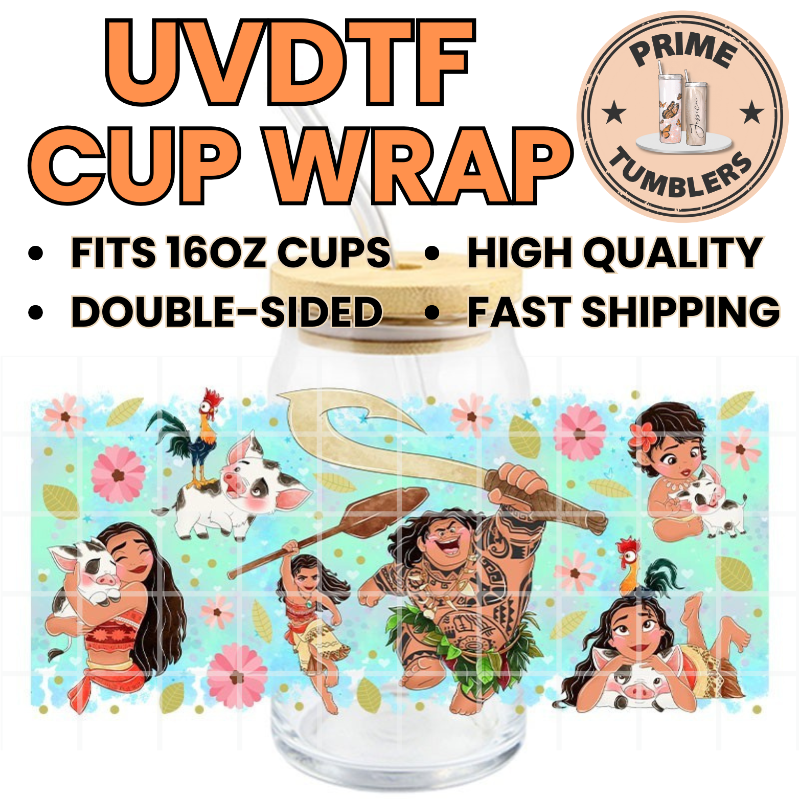 Simea, Maui, Moana, Pua and Heihei teal background movie girls 16oz UVDTF cup wrap, ready to apply STICKERS Disney